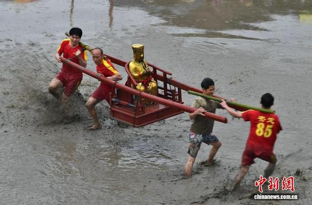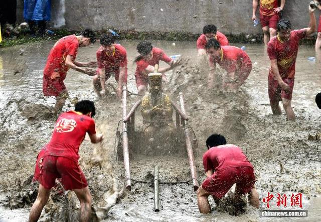 2月28日,“闹春田”客家民俗活动在福建省长汀县童坊镇举河村举行,村民们抬着上百斤重的关公像在泥田里奔跑打转,引得水浪翻滚、泥浆四射。“闹春田”又称“甩泥巴”“走春泥”,同时也是一项省级非遗民俗活动,已有数百年历史。“闹春田”民俗活动寓意着农田大地经过一个冬天的沉睡,通过这番嬉闹,唤醒沉睡的大地,迎接春耕的到来,是一个极富诗意的民间传统节俗。图为村民们在田间甩泥巴。中新社记者 张斌 摄