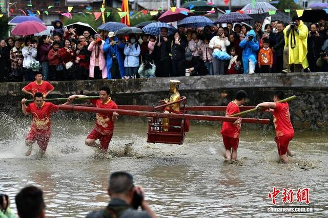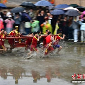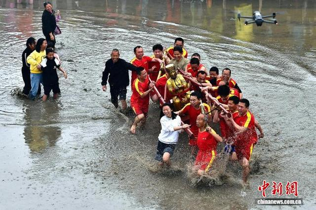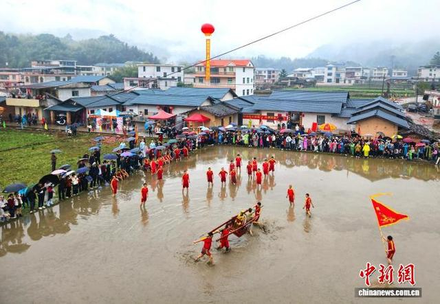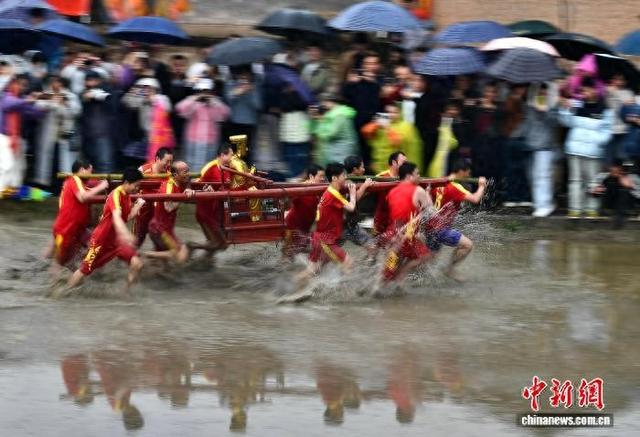 2月28日,“闹春田”客家民俗活动在福建省长汀县童坊镇举河村举行,村民们抬着上百斤重的关公像在泥田里奔跑打转,引得水浪翻滚、泥浆四射。“闹春田”又称“甩泥巴”“走春泥”,同时也是一项省级非遗民俗活动,已有数百年历史。“闹春田”民俗活动寓意着农田大地经过一个冬天的沉睡,通过这番嬉闹,唤醒沉睡的大地,迎接春耕的到来,是一个极富诗意的民间传统节俗。中新社记者 张斌 摄