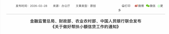 2月28日,金融监管总局、财政部、农业农村部、中国人民银行联合发布了《关于做好帮扶小额信贷工作的通知》(以下简称《通知》)。