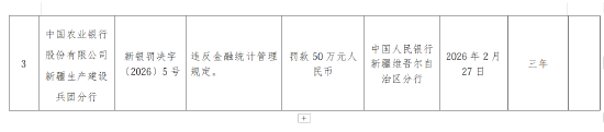 农业银行新疆生产建设兵团分行被罚50万元:违反金融统计管理规定 金融一线 02.2821:19 关注 2月28日金融一线消息,中国人民银行新疆维吾尔自治区分行行政处罚信息公开表显示,中国农业银行股份有限公司新疆生产建设兵团分行因违反金融统计管理规定,被罚款50万元。