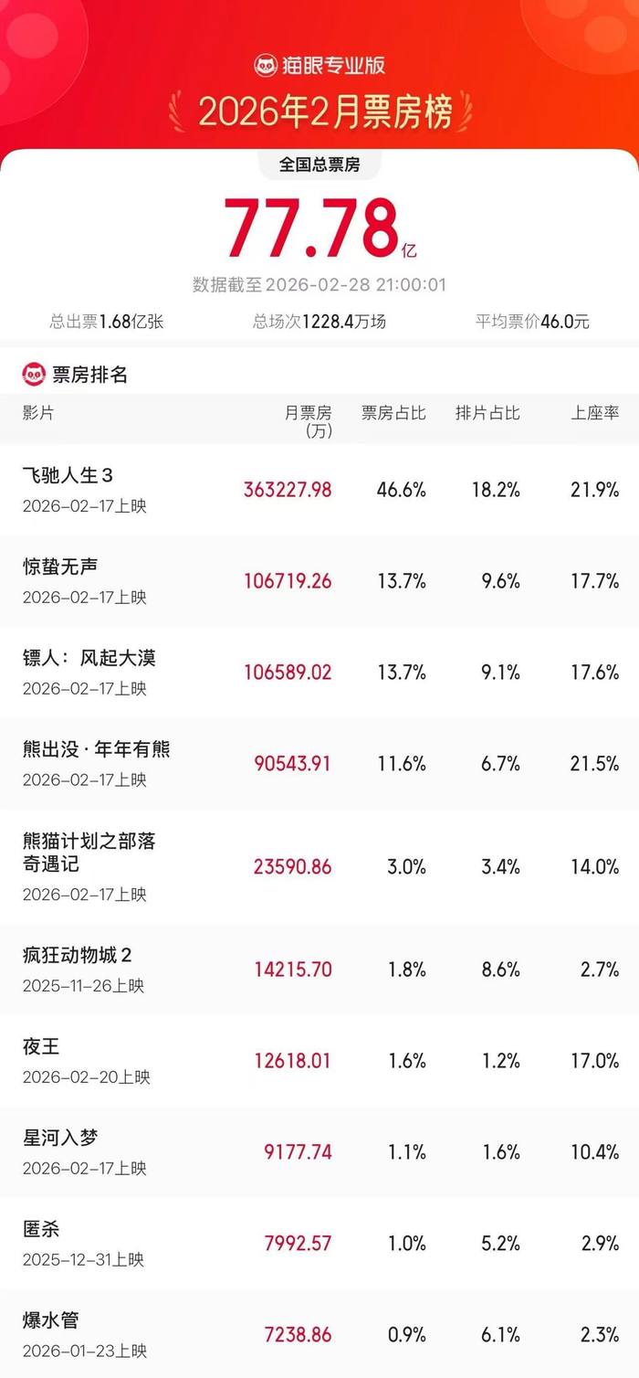 据猫眼专业版数据,截至2月28日21时,2026年2月总票房77.78亿,《飞驰人生3》成2月票房冠军,《惊蛰无声》《镖人:风起大漠》分列二三位。 ​