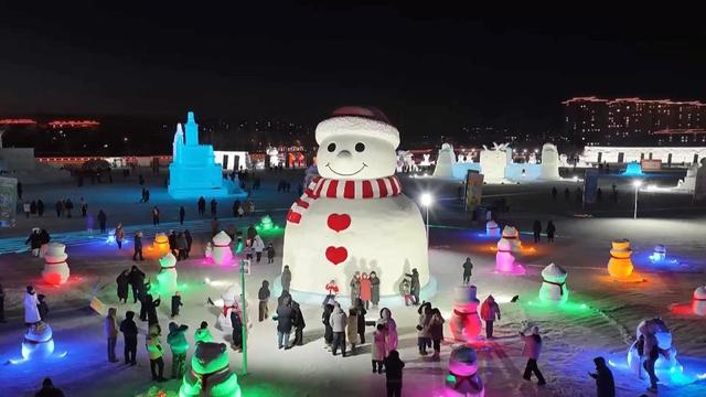 林郭勒盟的锡林湖上,百余座冰雕雪雕将湖畔装点成如梦似幻的冰雪童话世界。