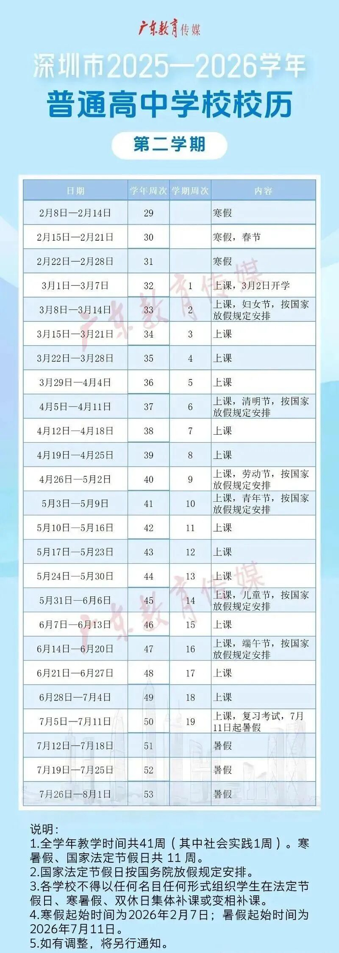根据深圳市2025-2026学年校历,深圳市义务教育阶段和普通高中阶段2026春季学开学时间为2026年3月2日,暑假开始时间为2026年7月11日,共19周。减去假期和周末后,实际教学天数在90天左右。