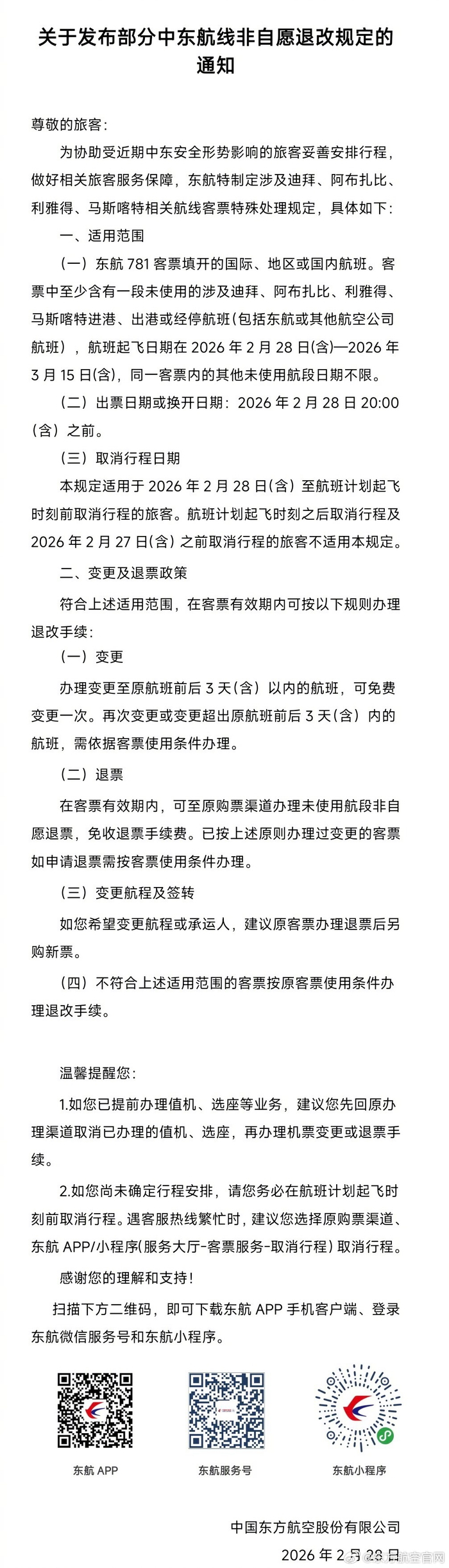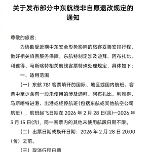 2月28日,东航发布通知称,为协助受近期中东安全形势影响的旅客妥善安排行程,做好相关旅客服务保障,东航特制定涉及迪拜、阿布扎比、利雅得、马斯喀特相关航线客票特殊处理规定。