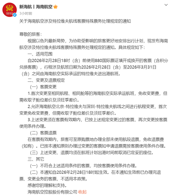 海南航空28日发布涉及特拉维夫航线客票特殊票务处理规定的通知——