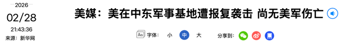 美国多家媒体2月28日报道,伊朗当天对美国在巴林、科威特、约旦、阿联酋和卡塔尔的军事设施发动报复性袭击。截至目前,尚未收到美军人员伤亡报告。