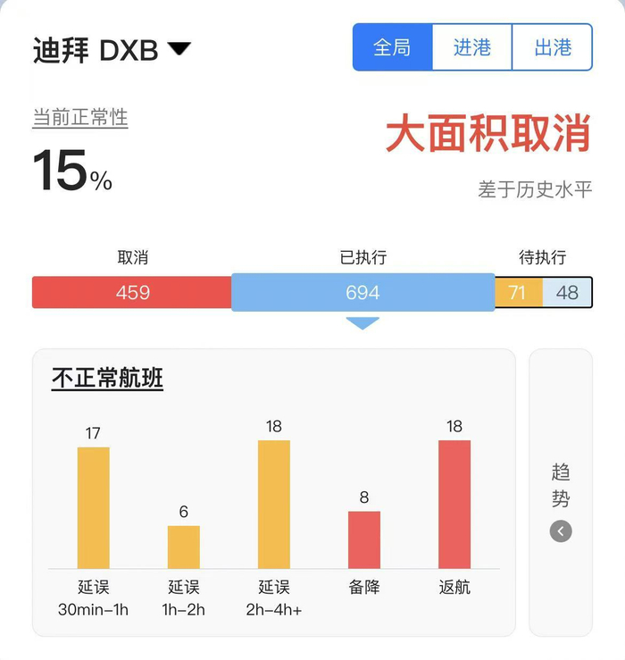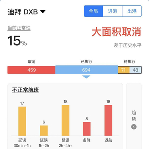 不少中东地区途经航班受军事冲突与领空关闭影响而返航或绕行。飞常准显示,中东三大航空枢纽——多哈、迪拜和阿布扎比机场均出现不同程度延误。截至北京时间2月28日22:30,以迪拜国际机场为例,有459班航班临时取消。