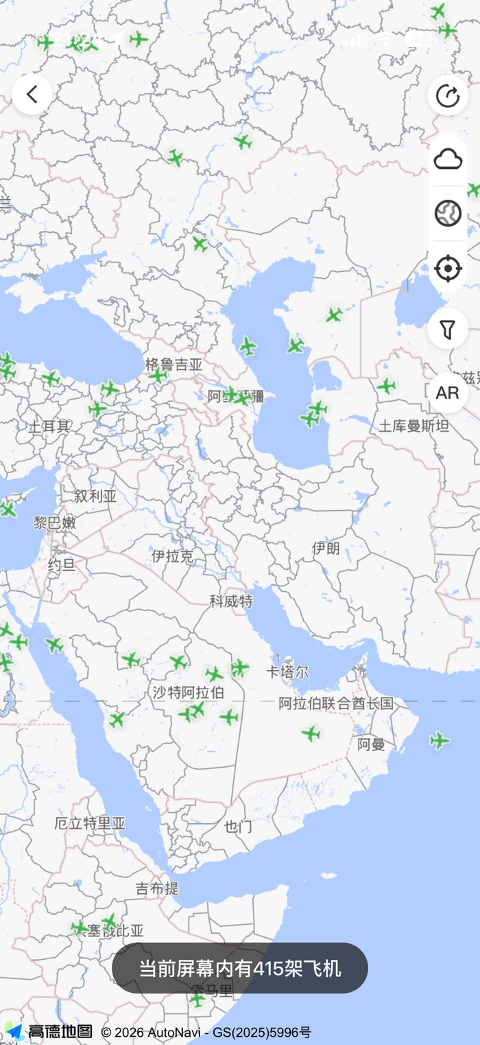 航旅纵横航班雷达显示,伊朗领空目前已经没有民航飞机经过。以色列、叙利亚、伊拉克等国上空也基本无飞机经过。