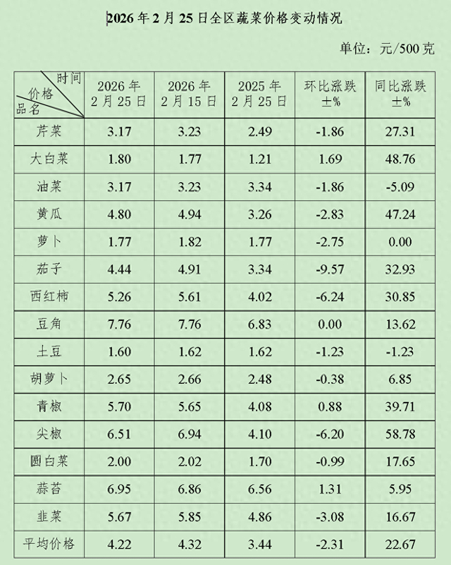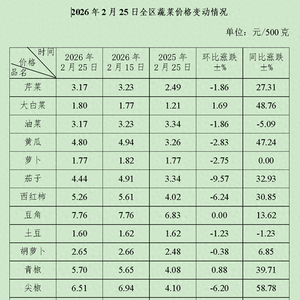 2月25日,内蒙古蔬菜综合平均零售价格为4.22元/500克,环比下降2.31%。2月15日至2月25日监测的15种蔬菜品种价格3涨11降1持平,下降幅度占前五位的品种为茄子、西红柿、尖椒、韭菜、黄瓜,分别下降9.57%、6.24%、6.20%、3.08%、2.83%。与去年同期相比,15个蔬菜品种综合平均零售价格上涨22.67%。
