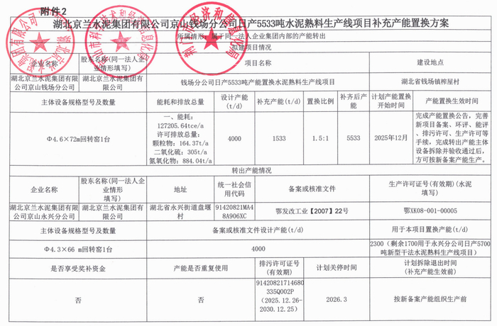 方案显示,湖北京兰水泥京山永兴分公司退出一条4000t/d熟料生产线,其中1700t/d产能用于补充同厂区一条4000t/d熟料线,补齐后产能5700t/d,置换比例1:1;