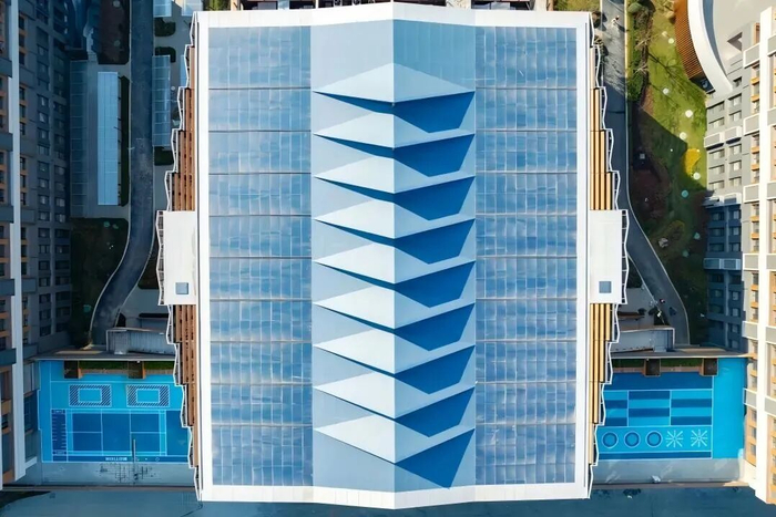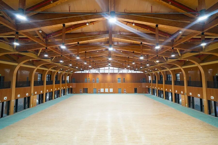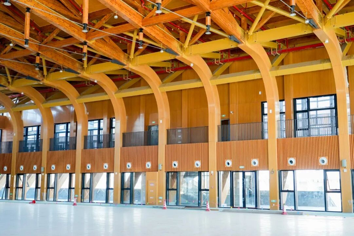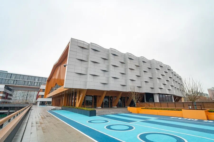 拾级而上,一栋外立面采用白色穿孔铝板打造出折线造型的现代化建筑映入眼帘,这便是风雨操场与食堂建筑。该建筑1—2层为食堂,3—4层为风雨操场,其中风雨操场采用钢木结构,大跨度屋面运用预应力张弦梁技术,目前已获得中国建筑节能协会颁发的近零能耗建筑认证。