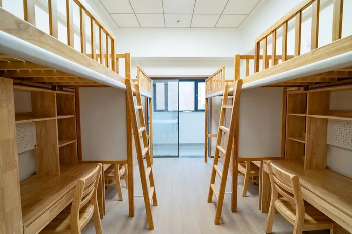 宿舍的吊顶、墙面、地面均采用装配式材料,看似木纹的门、大理石纹路的卫生间墙面,实则都是硅酸钙板通过不同工艺模拟而成,视觉效果美观,且现场污染少、施工速度快。