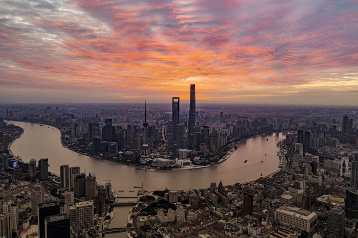 上海陆家嘴朝霞(2022年1月1日摄,无人机照片)。