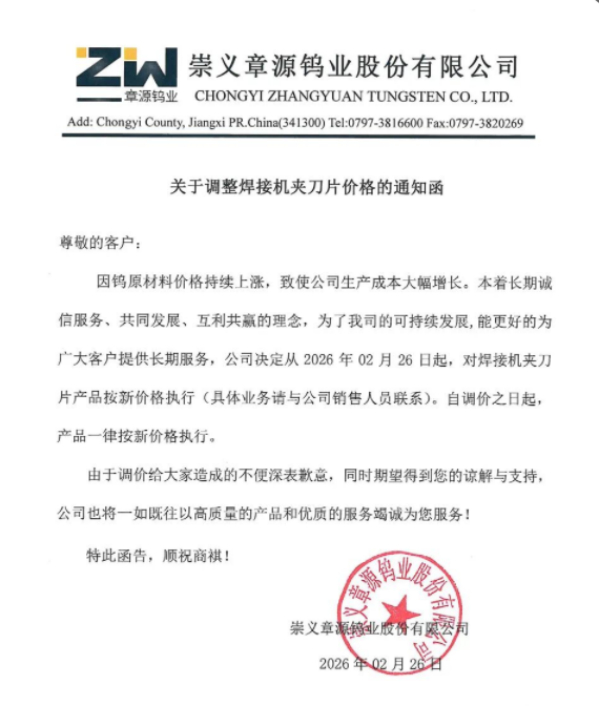 2月26日,章源钨业通过官方微信发布《关于调整焊接机夹刀片价格的通知函》。