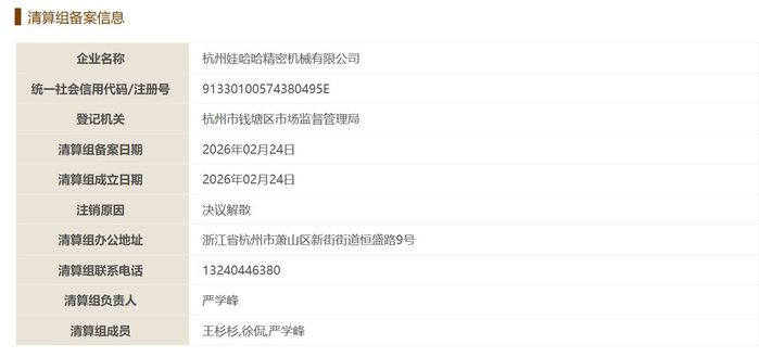 近日,有接近杭州娃哈哈精密机械有限公司(以下简称娃哈哈精机)人士向《每日经济新闻》记者透露,娃哈哈精机于2026年2月24日发布解散公示,现已依法进入解散程序。同时,其提供的材料显示,有娃哈哈精机员工收到了《终止劳动合同通知书》,员工与娃哈哈精机的劳动合同于2月28日终止。