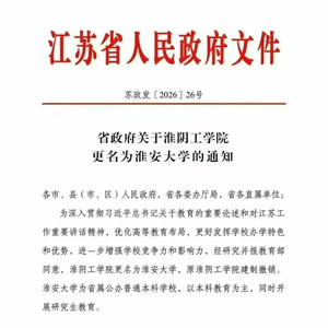 2月26日,江苏省政府发布关于淮阴工学院更名为淮安大学的通知。
