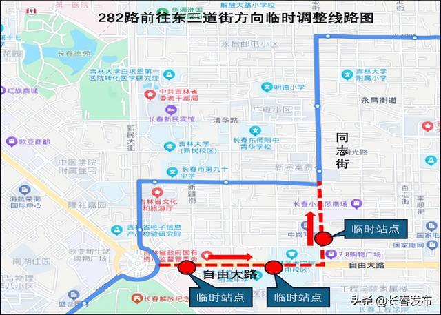 (一)282路前往东三道街方向调整为新民广场-自由大路-同志街;前往富豪花园方向调整为同志街-自由大路-新民广场。