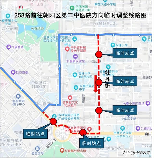 (四)258路前往香江家居方向调整为自由大路-同志街;前往朝阳区第二中医院方向调整为牡丹街-自由大路-工农大路。