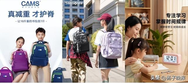 一款好书包是中小学生的开学刚需。CAMS的悬浮减重书包,专为小学生设计,通过多点承托等减重设计,可实现“10斤变7斤”减重效果,保护学生脊柱健康;新秀丽初高中学生书包,大容量能容纳超25本书,侧边口袋水杯雨伞不愁放,夜间反光条设计为上下学路的安全加分;Timess学生专用智能闹钟,培养学生自行早起好习惯,还有语音报时、星期显示等丰富功能,是让家长省心的开学必备好物。