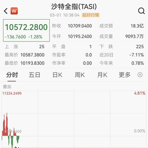 当地时间3月1日,沙特阿拉伯股市指数(TASI)开盘一度跳水跌近5%,截至发稿,跌幅已迅速收窄至1.2%。沙特国家银行、利雅得银行等银行股纷纷下挫。