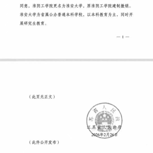2月26日,江苏省政府发布关于淮阴工学院更名为淮安大学的通知。