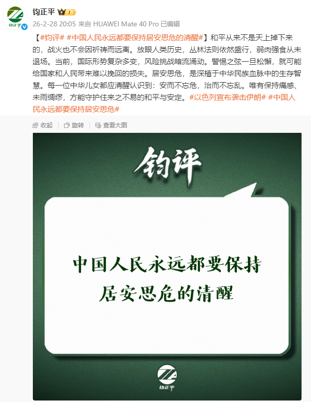 和平从来不是天上掉下来的,战火也不会因祈祷而远离。放眼人类历史,丛林法则依然盛行,弱肉强食从未退场。当前,国际形势复杂多变,风险挑战暗流涌动。警惕之弦一旦松懈,就可能给国家和人民带来难以挽回的损失。居安思危,是深植于中华民族血脉中的生存智慧。每一位中华儿女都应清醒认识到:安而不忘危,治而不忘乱。唯有保持痛感、未雨绸缪,方能守护住来之不易的和平与安定。