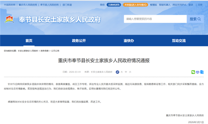 重庆市奉节县长安土家族乡通报“溶洞水体异常”:成立工作专班,相关部门同步采取整改措施