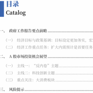 经济工作重点任务:(1)扩大内需预计是年度首要任务。以新需求引领新供给,以新供给创造新需求,促进消费和投资、供给和需求良性互动。消费方面,一是通过多渠道稳定和扩大就业、实施城乡居民增收计划等,增强居民消费能力;二是深入实施提振消费专项行动,优化实施“两新”政策,同时服务消费预计将是重要抓手。投资方面,预计强调发挥好政府投资作用,优化结构、提高民生占比,推进“两重”建设,同时激发民间投资活力。(2)加紧培育壮大新动能,加快高水平科技自立自强预计处于更加重要的位置上。预计强调企业科技创新主体地位,深化科技成果转化机制改革,打造创新引领现代化建设的标杆。新一轮重点产业链高质量发展行动将筑牢现代化产业体系的根基,“人工智能+”将成为新动能的重要引擎。(3)在改革攻坚中,深入整治“内卷式”竞争预计是重要议题。(4)化解重点领域风险将是持续性、常态化任务。一是着力稳定房地产市场,推动“好房子”建设,加快构建房地产发展新模式。二是积极有序化解地方政府债务风险,督促各地主动化债,多措并举化解地方政府融资平台经营性债务风险。(5)政府工作报告预计紧密围绕对外开放、协调发展、绿色转型、民生保障等领域进一步部署。十四届全国人大四次会议将审查“十五五”规划纲要草案,中长期改革与部署值得进一步关注。