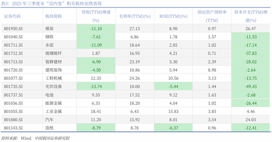 截至2025年三季度末,本轮“反内卷”重点产业中,综合营收增速、毛利率、净资产收益率、固定资产周转率、资本开支增速来看,工业金属、汽车、工程机械行业的景气度相对较高;光伏设备、造纸、建筑装饰的景气度相对较低。其中,2025年三季度末,光伏设备、造纸的营收(TTM)增速、净资产收益率(TTM)、资本开支(TTM)增速均为负值,业绩压力较大。