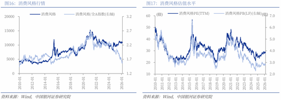 经历2021年初以来的调整后,当前消费风格估值处于历史低位,估值修复空间较大。截至2026年2月末,消费风格PE(TTM)为28.57倍,处于2010年以来35.06%分位数水平;PB(LF)为2.81倍,处于2010年以来11.01%分位数水平。