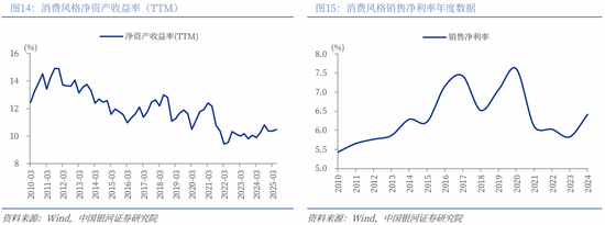 2025年三季度,消费风格ROE(TTM)为9.91%,这一指标自2011年以来长期处于震荡下行区间,2022年以来逐步回暖,当前处于2010Q1以来53%分位数水平。截至2024年,消费风格销售净利率指标为6.42%,以年度数据计算,该指标处于2010年以来64%分位数水平。