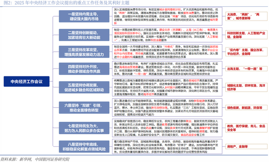 加紧培育壮大新动能,加快高水平科技自立自强预计处于更加重要的位置上。2023年中央经济工作会议强调“培育发展新动能”,2024年指出“必须统筹好培育新动能和更新旧动能的关系,因地制宜发展新质生产力”,2025年“坚持创新驱动,加紧培育壮大新动能”的表述中,突出“加紧”二字,彰显了抢抓新一轮科技革命与产业变革机遇的紧迫感,更是体现了以创新驱动加快发展新质生产力、推动经济高质量发展的政策导向。两会预计强调企业科技创新主体地位,深化科技成果转化机制改革,打造创新引领现代化建设的标杆,2025年中央经济工作会议提出“建设北京(京津冀)、上海(长三角)、粤港澳大湾区国际科技创新中心”。新一轮重点产业链高质量发展行动将进一步筑牢现代化产业体系的根基,“人工智能+”将成为新动能的重要引擎。
