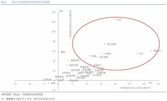“新质”概念业绩有望逐步兑现。以科技和先进制造龙头为代表,其归母净利润累计同比增速在近期呈现出回暖迹象。2025年前三季度来看,传媒、电子、计算机、电力设备、机械设备等行业增速较高。从一致预测2年复合增长率来看,具备新质特征的重点板块有望处于盈利增长阶段,特别是电力设备、计算机、国防军工、传媒、电子等行业净利润2年复合增速预计处于较高水平。