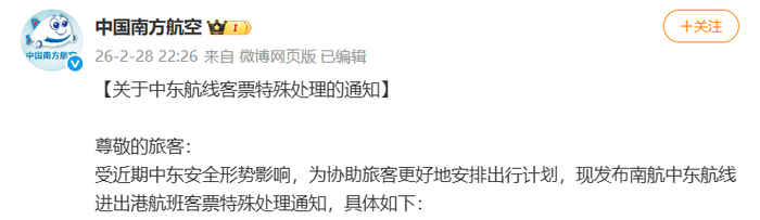 2月28日晚,受中东局势影响,国航、东航、南航等国内多家航空公司相继发布了涉及中东地区航班机票特殊处理方案。