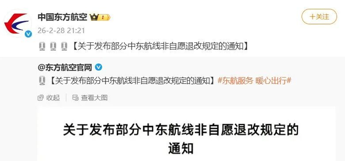 东航规定,旅客购买的机票至少含有一段未使用的涉及迪拜、阿布扎比、利雅得、马斯喀特的进港、出港或经停航班,航班起飞日期在2026年2月28日(含)至2026年3月15日(含),可免费变更一次至原航班前后3天(含)以内的航班。
