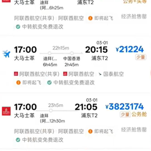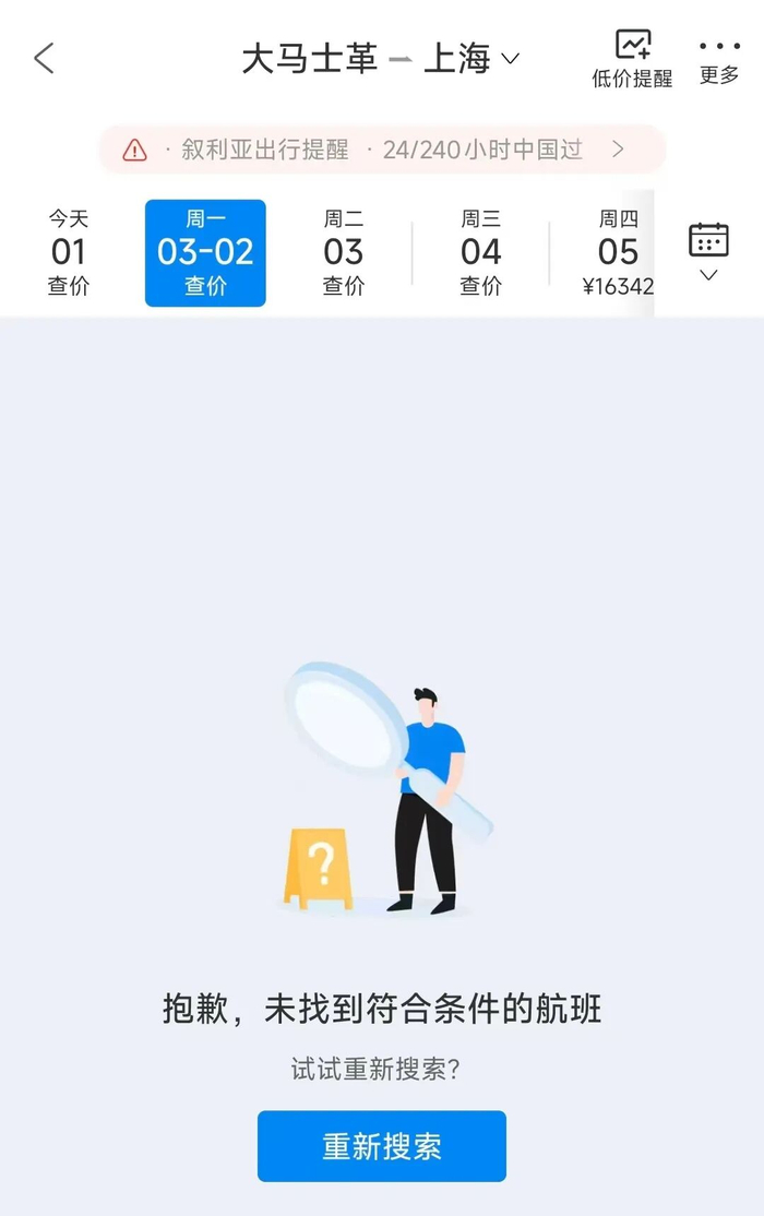 记者随后查询了同程旅行,2月28日大马士革到上海已无机票,但可以购买到达南京等周边城市,价格为万元以内;3月1日大马士革到上海也有机票,最贵的为9834元。