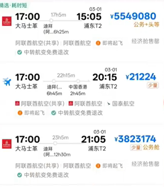 记者注意到,网友发布的图片价格不一,有的几十万,有的一百多万,最高竟达到了近550万元。记者在携程APP上搜索大马士革到上海的机票,2月28日到3月8日已经无法订票,平台显示“未找到符合条件的航班”。