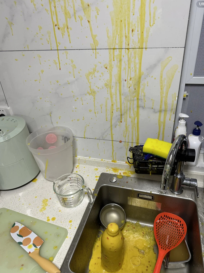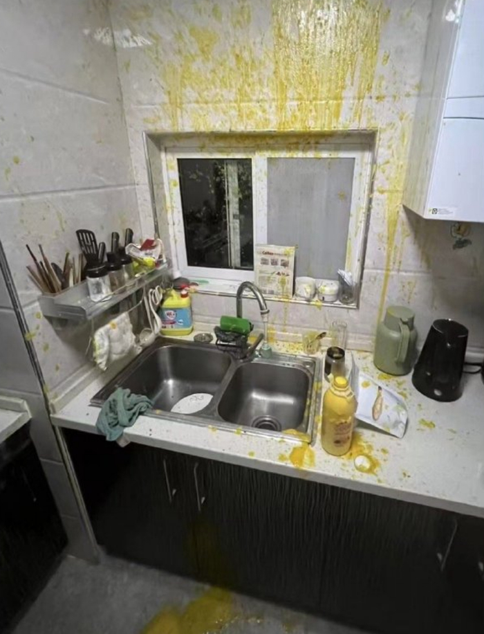 导致家中天花板等地方都被溅上杨枝甘露