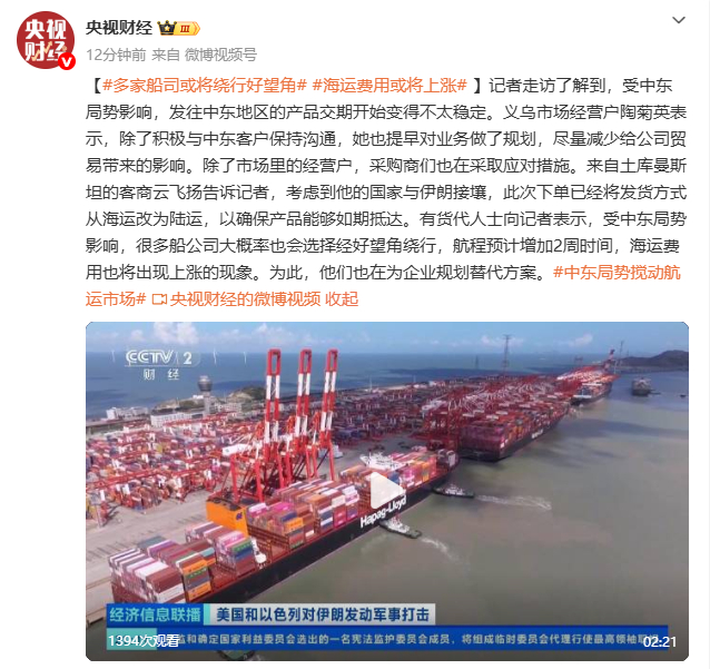 记者走访了解到,受中东局势影响,发往中东地区的产品交期开始变得不太稳定。义乌市场经营户陶菊英表示,除了积极与中东客户保持沟通,她也提早对业务做了规划,尽量减少给公司贸易带来的影响。除了市场里的经营户,采购商们也在采取应对措施。来自土库曼斯坦的客商云飞扬告诉记者,考虑到他的国家与伊朗接壤,此次下单已经将发货方式从海运改为陆运,以确保产品能够如期抵达。有货代人士向记者表示,受中东局势影响,很多船公司大概率也会选择经好望角绕行,航程预计增加2周时间,海运费用也将出现上涨的现象。为此,他们也在为企业规划替代方案。