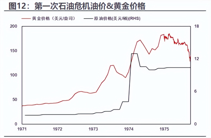 1973年第四次中东战争:油价飙升,黄金启动第一轮主升。天风证券复盘指出,1973年10月第四次中东战争爆发,OPEC宣布石油禁运,国际油价从每桶2.5美元左右跃升至近12美元,美国经济开始走入“滞胀”——通胀率飙升,GDP转负陷入衰退。这一阶段,黄金的“抗通胀属性”和“避险属性”引发资金簇拥,价格大涨,从1971年布雷顿森林体系解体后的自由浮动价,到1974年末已涨至180美元/盎司左右。