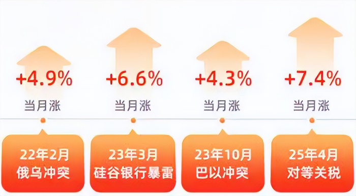 数据来源:ifind,以上均指SGE黄金9999(AU9999)于风险事件发生当月涨幅。金价走势仅供参考,不代表投资建议,不预示未来表现。