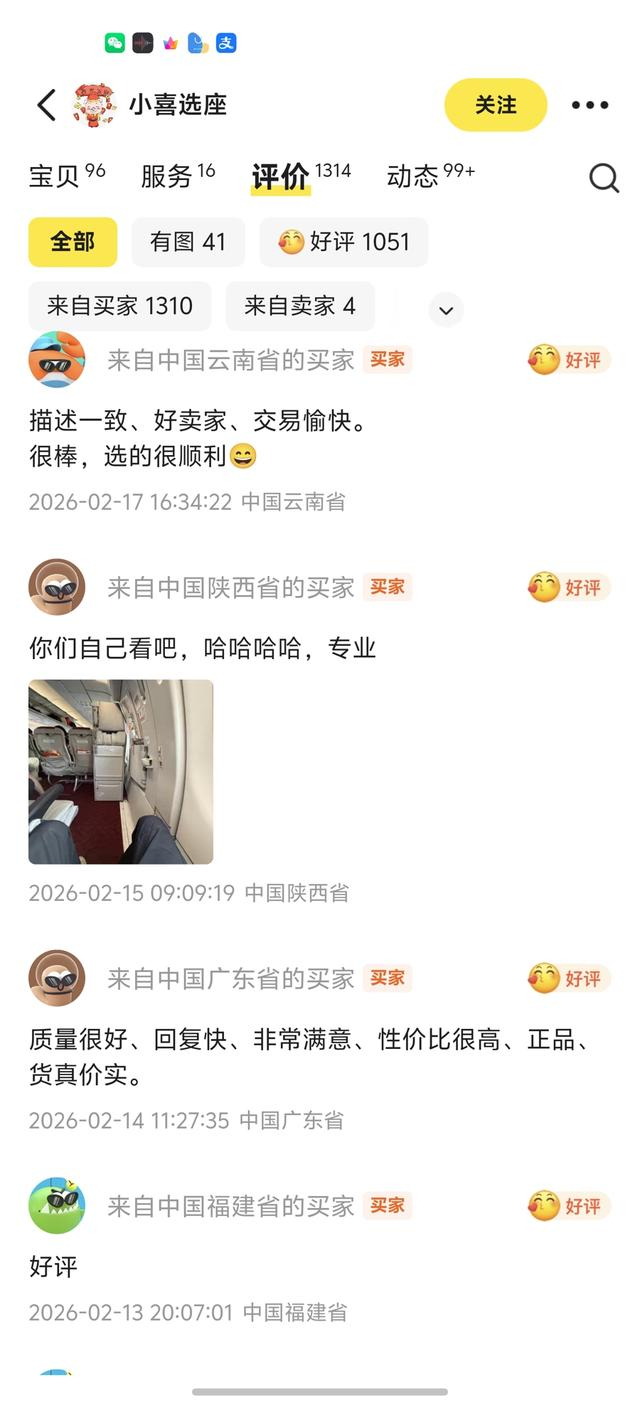 记者采访还发现,为了帮助旅客选座,有商家推出了代办选座服务。在闲鱼等二手交易平台上,不少商家提供各类选座服务,有的商家号称“前排,第一排,安全出口,锁住位置均可办理”。记者点击该商家,上架商品均为各航司的选座服务,1300多条买家评价显示近一年好评率100%。记者联系一名商家,对方表示自己是航司内部人员,旅客只需付90元,并且满足相关身体要求,即可帮助办理安全出口附近的宽敞座位。