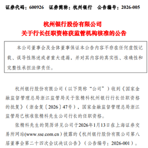 3月2日金融一线消息,杭州银行日前发布公告称,该行收到《国家金融监督管理总局浙江监管局关于张精科杭州银行行长任职资格的批复》(浙金复〔2026〕47号),国家金融监督管理总局浙江监管局已核准张精科公司行长的任职资格。