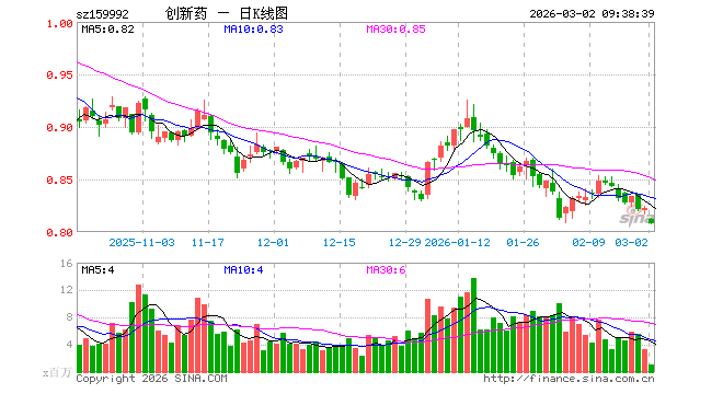 3月2日,创新药ETF(159992)开盘跌1.22%,报0.812元。创新药ETF(159992)重仓股方面,药明康德开盘跌1.95%,恒瑞医药跌1.73%,华东医药跌0.78%,复星医药跌0.72%,科伦药业跌1.08%,百济神州跌1.51%,长春高新跌2.13%,康龙化成跌1.08%,泰格医药跌1.74%,艾力斯跌0.77%。
