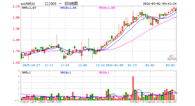 3月2日,中证2000ETF博时(159533)开盘跌1.53%,报2.053元。中证2000ETF博时(159533)重仓股方面,鸿富瀚开盘跌1.77%,亚太股份跌1.85%,新黄浦跌1.74%,中原内配跌1.66%,海伦哲跌1.06%,龙磁科技跌0.96%,慧智微跌1.25%,华源控股跌1.89%,丽尚国潮跌1.51%,永创智能跌2.02%。