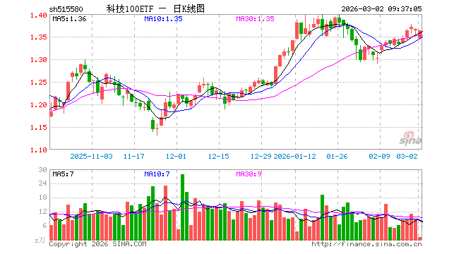 3月2日,科技100ETF(515580)开盘跌1.54%,报1.346元。科技100ETF(515580)重仓股方面,恒瑞医药开盘跌1.73%,阳光电源跌1.67%,京东方A跌0.89%,立讯精密跌1.81%,中兴通讯跌1.79%,中微公司跌1.17%,科大讯飞跌1.90%,特变电工跌1.25%,海康威视跌1.37%,思源电气跌0.40%。