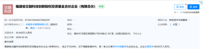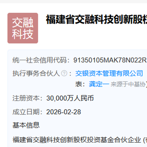 3月2日金融一线消息,天眼查平台显示,福建省交融科技创新股权投资基金合伙企业(有限合伙)于2月28日成立,位于福建省福州市,企业注册资本30000万人民币,是一家以从事资本市场服务为主的企业。其经营范围包含:以私募基金从事股权投资、投资管理、资产管理等活动。