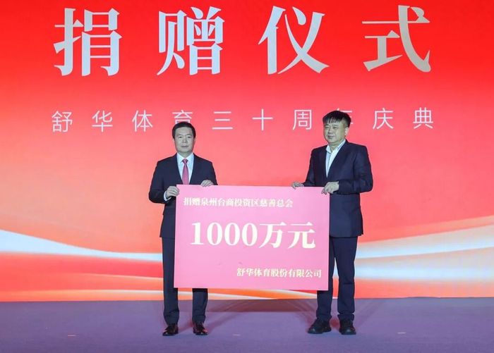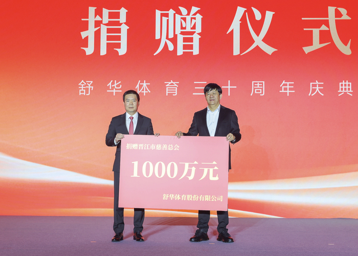 2月28日,舒华体育举行“三十而立·筑梦全球”三十周年庆典,现场捐赠总价值2400万元的慈善资金和物资。捐赠仪式现场,舒华向晋江市慈善总会、泉州台商慈善总会各捐赠1000万元,用于支持本地医疗、教育、扶贫等慈善事业;同时向福建医科大学附属第二医院、泉州市第一医院捐赠价值共400万元的健身服务。