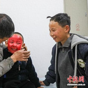 3月1日,农历正月十三,在青海省西宁市湟中区千户营村,19台以高、悬、妙、奇著称的“空中杂技”千户营高台表演吸引八方民众观看。国家级非物质文化遗产代表性项目——千户营高台是当地独有的民间艺术形式,已有600多年历史,是融合绘画、刺绣、木雕的高空造型艺术。今年的高台演出中,4至9岁的孩童扮成传统戏曲及创新主题角色,演绎特色民俗文化。图为早晨7点,父亲为5岁半的张永耀(中)化关公角色妆容。中新社记者 马铭言 摄