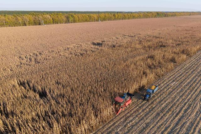 2025年10月13日,在黑龙江省肇东市五里明镇东升村应用中国农业大学肇东实验站集成“大垄双行密植+水肥一体化+秸秆粉碎深埋”技术模式的试验田里,当地农机专业合作社的农民在收获玉米(无人机照片)。新华社记者 谢剑飞 摄
